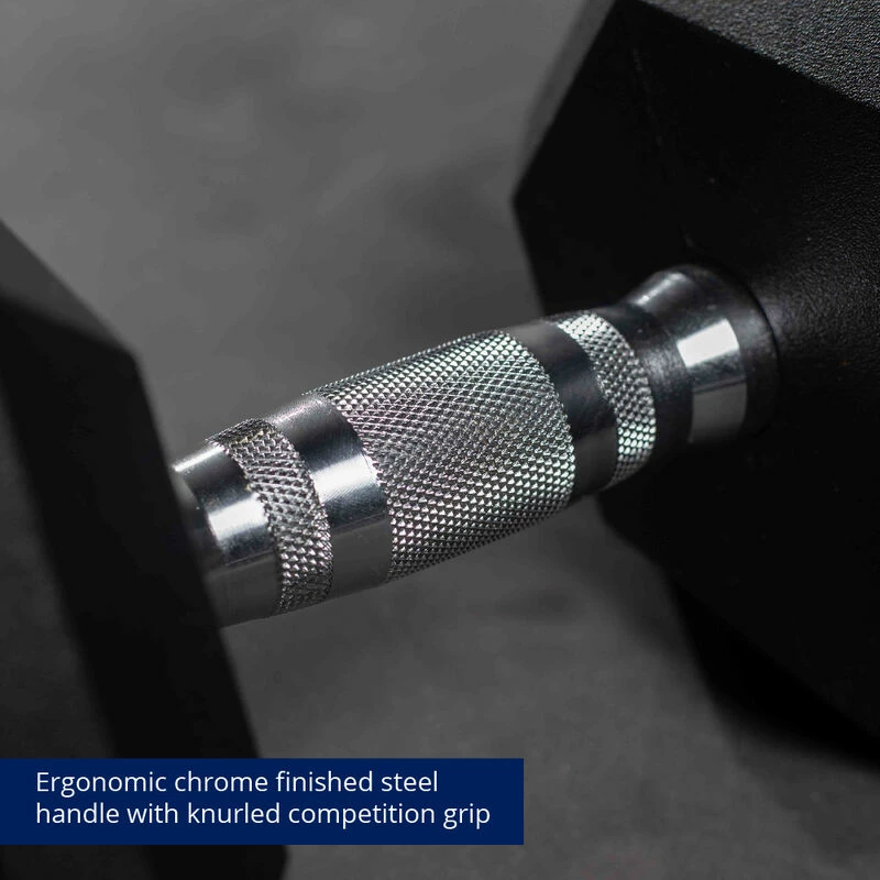 The Rubber Coated Hex Dumbbell Set is offered in pairs of 5-pound increments from 5 to 50-pounds. Each dumbbell features an ergonomic chrome finished handle with knurled competition texture for a comfortable and firm grip that holds up to use and weather. The durable, black rubber hexagonal heads feature embossed weight increments on two sides for easy identification. These dumbbells are a great addition to any gym, whether you are just starting or a seasoned lifter.