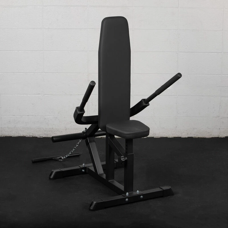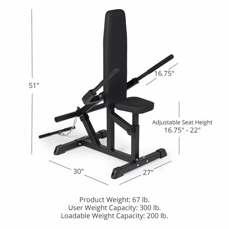 The Plate Loaded Seated Dip Machine is a two-way specialty training equipment that offers a great upper body workout focusing on your pecs, triceps, and deltoids. By training with the Dip machine vs performing full body dips, you are taking less tension off your shoulders and isolating the triceps. It is built from durable steel and features an adjustable seat, a pivoting arm mechanism attached to the seat frame with an eyelet on the back of the arm frame to attach a curl bar to perform bicep curls. In addition, the arm incorporates dual 11″ loadable weight plate sleeve that will hold up to 200 LB and is compatible with Olympic-sized weight plates.