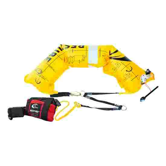 The RESTUBE lifeguard was developed in close collaboration with the Swiss Lifesaving Society (SLRG), as well as the Royal National Lifeboat Institution (RNLI), the German Life Saving Association (DLRG) & water rescue service (Wasserwacht). The principal of this life-saving device is the same: an inflatable buoy with an attached CO2 canister. It is also packed into a small pouch that can be worn on the waist. Pull the release and the buoy inflates itself in next to no time.