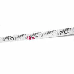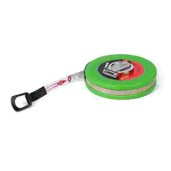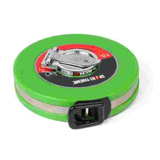 The Sport-Thieme double-sided fibreglass measuring tape is wound inside a sturdy steel capsule and consists of parallel glass silk fibres embedded in plastic. After use, simply wind the tape back in again using the little crack handle. After a length of 20 cm, there is a practical hand strap on the back of the tape.