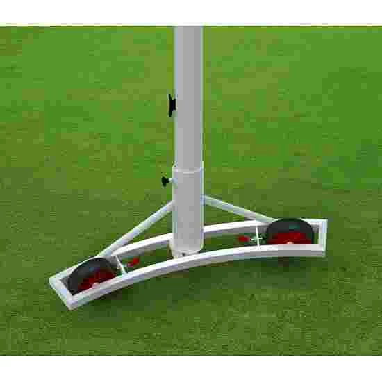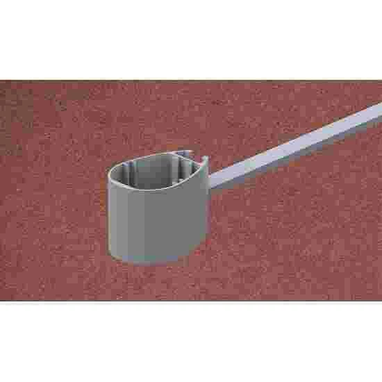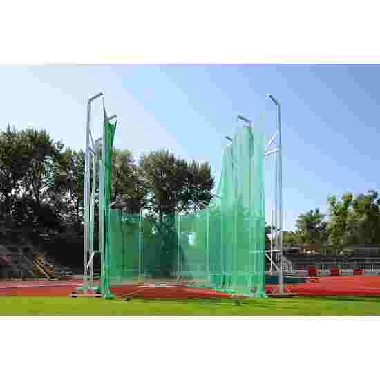 This high-quality hammer throw safety cage with its 10 posts with angled support booms (made from aluminium) offers the best quality. The posts, with 98×142-mm tubing, natural aluminium and additional internal reinforcement come supplied with 10 standard ground sockets with covers. On both hinged wings you’ll find a practical net-raising device (rope, winder). 600 kg. Net and sand bags not included.