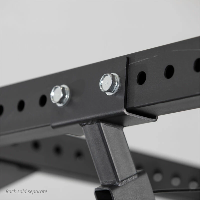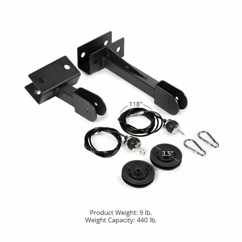 The Tricep and Lat Pulley System by Titan Fitness® is a bolt-on pulley attachment designed to create a dynamic pulley system on your Short or Tall T-3 Series Power Rack. This system mounts in-between the uprights of your power rack and features two rack-mounted pulley attachments, 118-inch cable, two carabiners, and all the assembly hardware needed. The setup can hold a weight capacity of 440-pounds, perfect for performing tricep pushdowns, lat pull-downs, and other exercises.