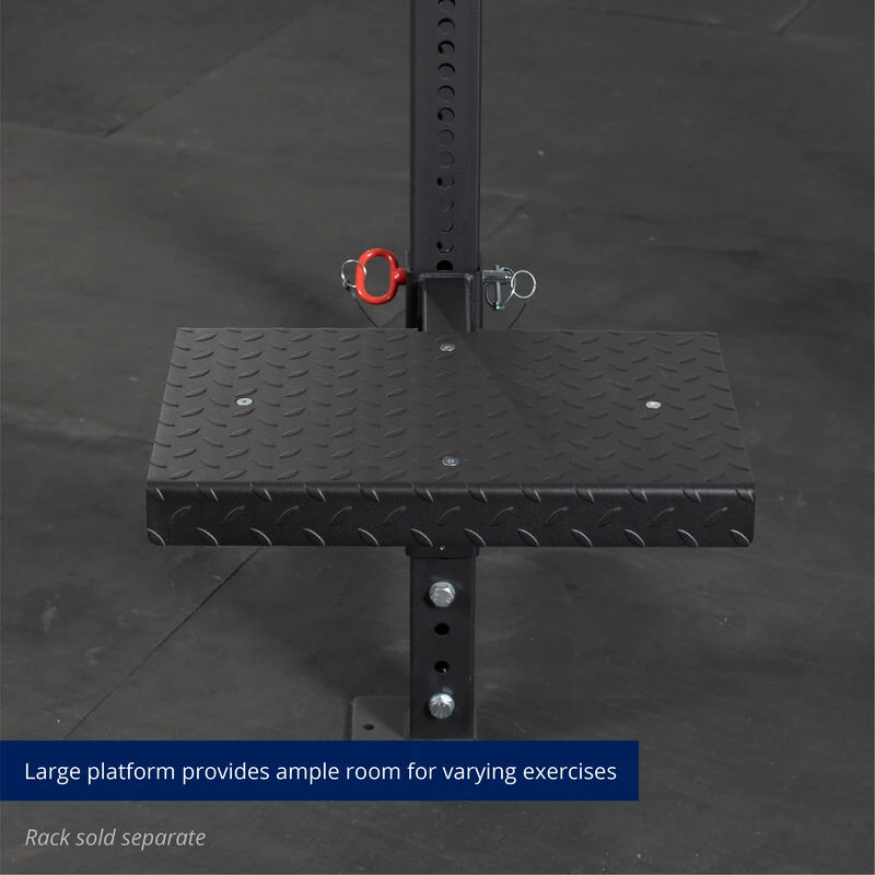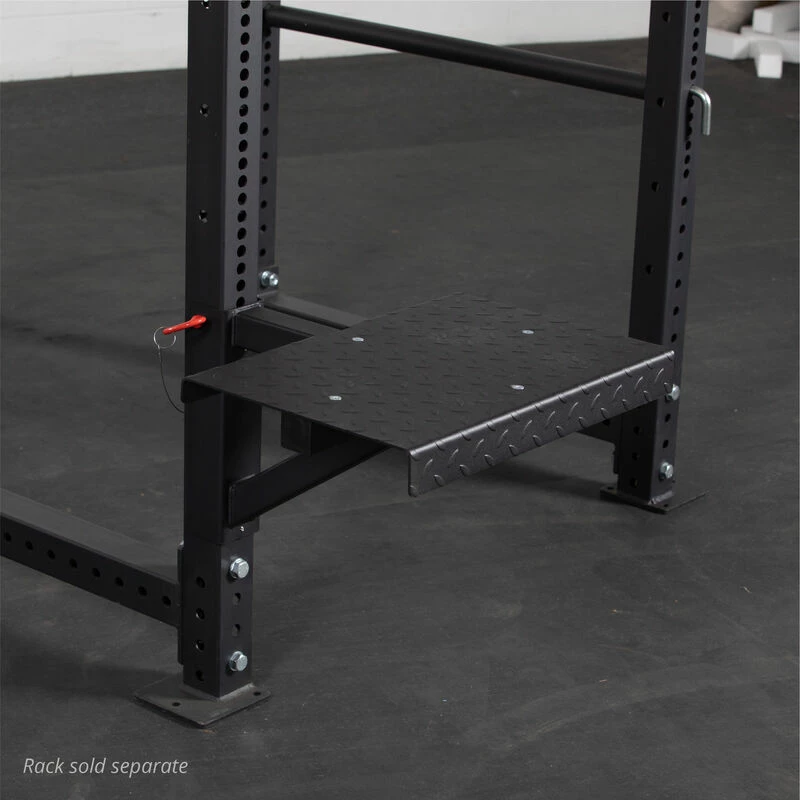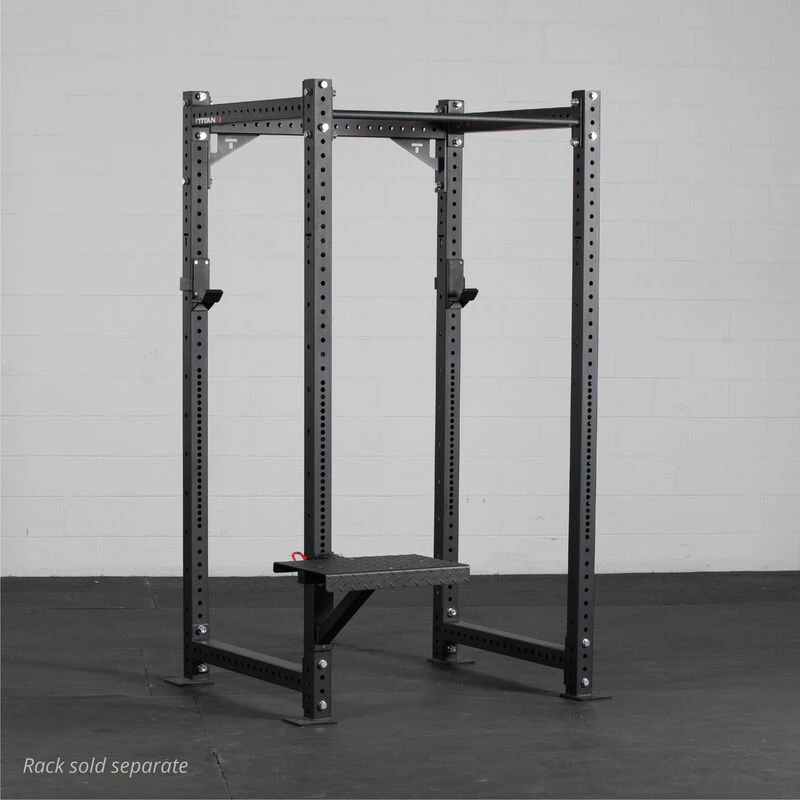 The Step-Up Platform by Titan Fitness® is a rack-mounted attachment designed for the X-3 Series Power Rack. This easily adjustable bracket fits on the outside of your 3 x 3-inch uprights and secures with a quick pin allowing you to mount the step at your desired height. The large diamond-plated textured platform can hold a weight capacity of up to 550-pounds and is ideal for performing dumbbell step-ups, low impact plyometric drills, aerobics, and many other exercises.
